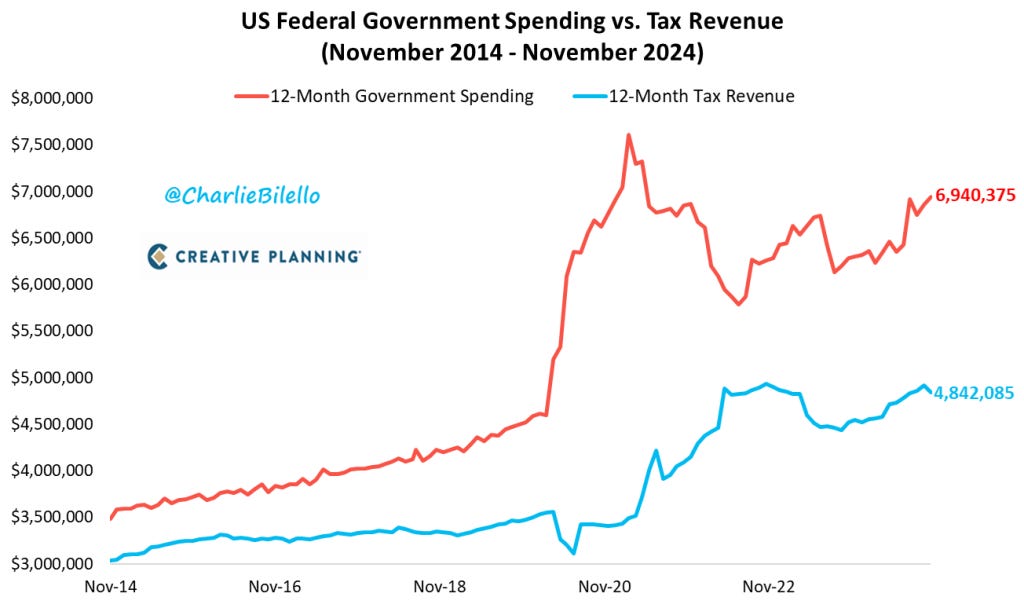· Donald Trump danas (u ponedjeljak, 20.1.) službeno stupa na dužnost američkog predsjednika. U kakvom stanju preuzima gospodarstvo? Naizgled se čini u jako dobrom: BDP raste solidnim stopama od 2,5 do 3 posto, a stopa nezaposlenosti je, iz povijesne perspektive gledano, jako niska i kreće se oko 4,1%. No, nikako ne treba smetnuti s uma da je to u velikoj mjeri posljedica nabujalog proračunskog deficita koji iznosi golemih 1,83 bilijuna dolara ili oko 6,5% BDP-a. Takvi deficiti ranije nikada nisu viđani osim u razdoblju velikih kriza, a sada je postao standard. Štoviše, Amerikanci su na dobrom putu da ove godine prebace i granicu od 2 bilijuna dolara deficita (kao što možemo vidjeti na sljedećoj slici). Novoosnovani DOGE ured na čelu s Elonom i Vivekom pokušat će srezati određeni neproduktivni dio državne potrošnje, ali ovdje govorimo o golemoj rupi koju ni par stotina milijardi dolara potencijalnih ušteda ne može ni približno zatvoriti. Prihodi od carina također ne mogu znatnije pomoći, čak i ako zanemarimo sve negativne posljedice koje će proizaći iz trgovinskoga rata. Ukratko, dobro stanje američke ekonomije u velikoj je mjeri posljedica življenja na dug: lako je rasti 2,5-3 posto kad ti je deficit 6-7 posto BDP-a.