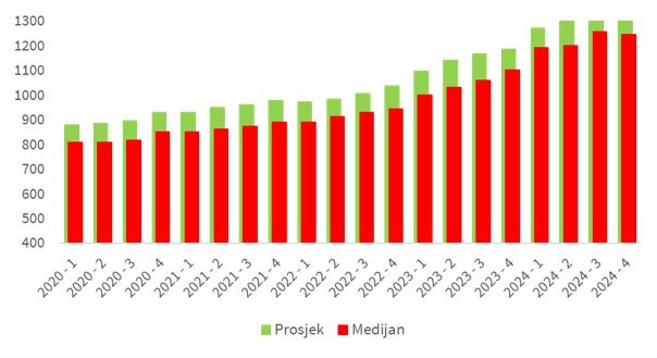 · Uz podatke državnih statističara, uvijek je zgodno vidjeti i istraživanja privatnih kompanija o kretanju plaća u Hrvatskoj. Tako je prema analizi portala MojPosao u 2024. godini prosječna mjesečna neto plaća s uključenim dodacima na plaću u Hrvatskoj iznosila 1346 eura, što je 12 posto više nego prethodne godine. Medijan plaće je iznosio 1242 eura, što je rast za 15 posto te ukazuje na činjenicu da su niže plaće rasle više nego visoke. Najveći rast plaća zabilježen je u javnom sektoru, gdje su plaće porasle za 21 posto. Sličan trend vidljiv je i prema tipu vlasništva poduzeća pa je tako najveći rast plaća ostvaren u javnoj i lokalnoj samoupravi, za 15 posto, te državnim tvrtkama, za 14 posto. U privatnim poduzećima zabilježen je nešto skromniji rast od deset posto u domaćim i devet posto u stranim kompanijama, stoji u analizi.