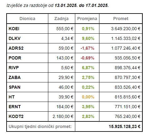 · Glavni dionički indeksi porasli su prošlome tjednu: CROBEX je porastao za 1,1 posto, a CROBEX10 za 0,70 posto. Sektorski indeksi su tjedan završili u rasponu od -0,64 posto koliko bilježi CROBEXnutris do +4,18 posto koliko je porastao CROBEXkonstrukt. Tjedne promjene deset najlikvidnijih dionica kretale su se u rasponu od -1,67 posto do +9,60 posto. Najlikvidnije izdanje Končar EI je tjedan završilo rastom za 0,9 posto na 555,00 eura uz 2,5 milijuna eura redovnog prometa i 1,1 milijun eura blok prometa. Dalekovod bilježi promet od 1,1 milijun eura i rast za 9,60 posto. Povlaštena dionica Adrisa trgovana je u iznosu nešto većem od milijun eura uz pad od 1,67 posto.